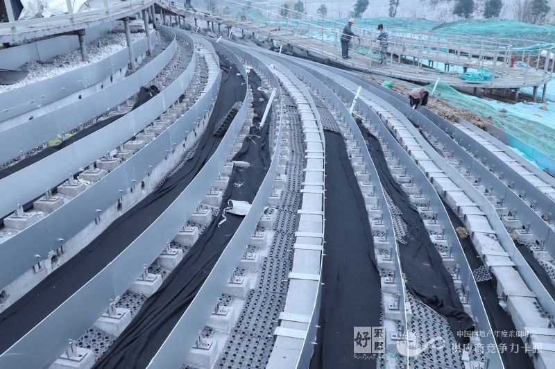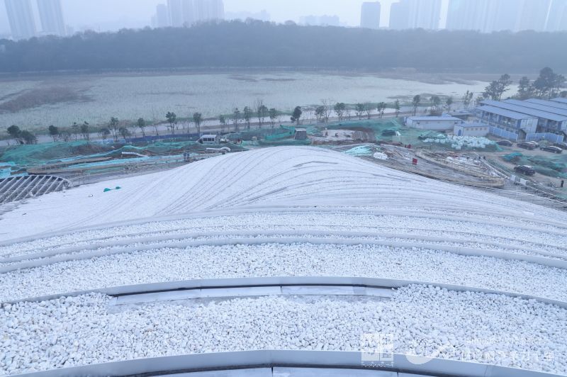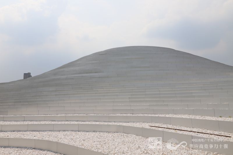 起伏的屋面以略顯抽象的等高線階梯狀造型完成,階梯的側(cè)面是銀色的金屬表面,頂面則為白色的石子和低矮的綠植。這樣人們從地面遠(yuǎn)觀建筑,會(huì)是一個(gè)有著金屬光澤的帶有些未來感的體量,假如坡面布滿綠化,那么它看上去就與自然山包無異,盡管這是以地景的形態(tài)策略而設(shè)計(jì)的,但還是希望存在一種建筑感,所以梯田狀的屋面上也沒有滿布綠植,更多的是白色的石子。