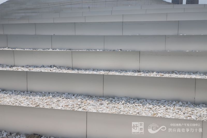 綠植主要布置在“山腳”的位置。金屬收邊的等高線梯田做法也會(huì)使人們從“山”下向上和“山”上向下有著不同的視覺感受,從下向上看到更多的銀色金屬面,從上向下則看到更多的綠植和石子。