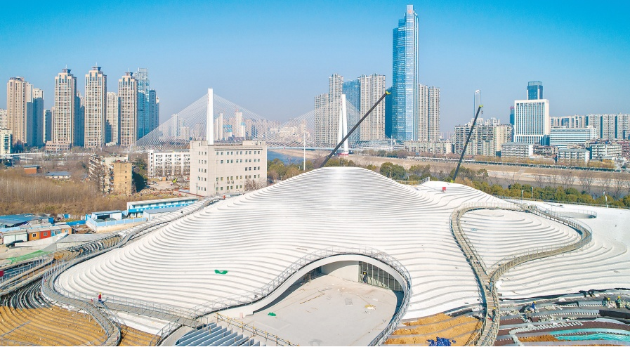 武漢美術(shù)館(琴臺館)位于漢陽知音大道77號,與琴臺大劇院和琴臺音樂廳構(gòu)成文化場所矩陣,兩側(cè)有月湖公園和漢陽江灘,配備有大型停車場。為了使琴臺館與周邊環(huán)境相融合,特別是減輕建筑體量對自然湖面的壓迫,場館向月湖的方向采用了起伏的自然地形造型,遠(yuǎn)觀仿佛一片“銀白梯田”,從空中俯瞰又似一顆石子擲進(jìn)湖心激蕩起的一圈圈漣漪。