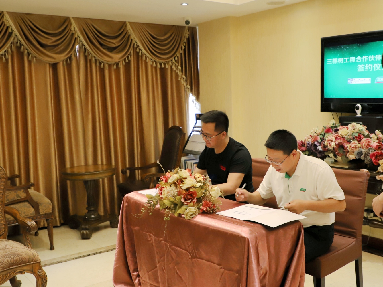 好來屋董事長廖才清(左)與三棵樹大區(qū)總監(jiān)陳祥朋(右)共同簽訂五年戰(zhàn)略規(guī)劃簽約書